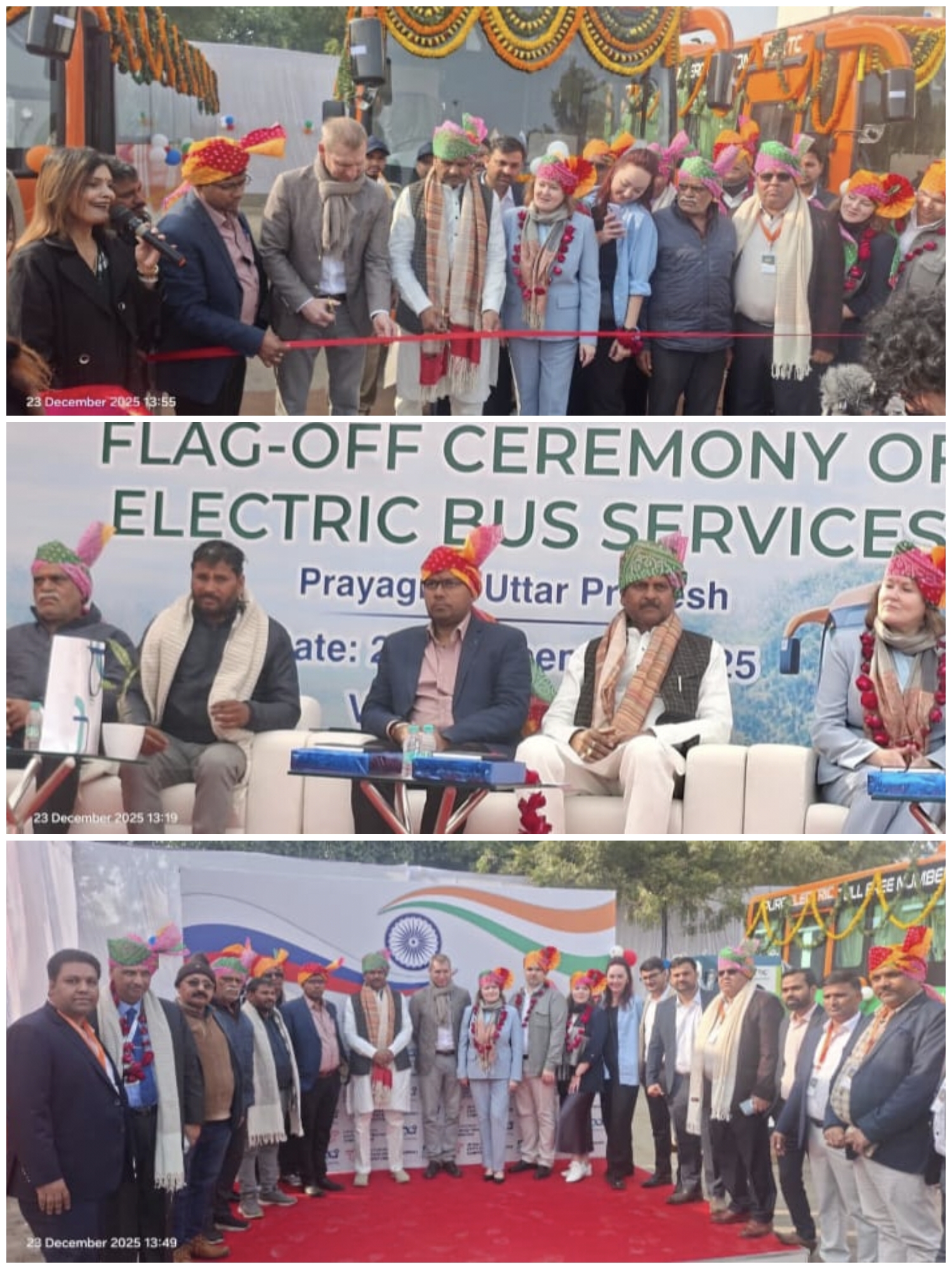 संजय द्विवेदी प्रयागराज।स्वच्छ हरित एवं आधुनिक सार्वजनिक परिवहन व्यवस्था को सुदृढ़ करने की दिशा में एक महत्त्वपूर्ण पहल के अन्तर्गत आज लीडर रोड डिपो कार्याशाला प्रयागराज में आर० जी०मोबिलिटी द्वारा 06 इलेक्ट्रिक बसो का शुभारम्भ किया गया जिसका संचालन प्रयागराज से वाराणसी अयोध्या कानुपर एवं लखनऊ मार्गो पर किया जायेगा।इस अवसर पर कार्यक्रम के मुख्य अतिथि के रूप में प्रयागराज के महापौर गणेश केसरवानी एवं विशिष्ट अतिथि के रूप में उत्तर प्रदेश राज्य सड़क परिवहन निगम प्रयागराज क्षेत्र के क्षेत्रीय प्रबन्धक रविन्द्र कुमार सिंह उपस्थित रहे।परिवहन निगम की ओर से कार्यक्रम में वरिष्ठ अधिकारियो के रूप में सहायक क्षेत्रीय प्रबन्धक(वित्त)शिव कुमार गुप्ता सहायक क्षेत्रीय प्रबन्धक सिविललाइन्स डिपो- डी०के०तिवारी सहायक क्षेत्रीय प्रबन्धक प्रयाग डिपो-प्रशान्त दीक्षित एवं सहायक क्षेत्रीय प्रबन्धक सिविललाइन्स डिपो जयकरण प्रसाद उपस्थित रहे।बस आपरेटर एटीएस की ओर से चयरमैन राकेश गुप्ता प्रबन्ध निदेशक सचिन गुप्ता मुख्य कार्यकारी अधिकारी ब्रिजेन्द्र सिंह सहित निदेशकगण विनोद पाण्डे एवं अजय गुप्ता उपस्थित रहे।इस अवसर पर वक्ताओ द्वारा बताया गया कि प्रयागराज-वाराणसी अयोध्या कानपुर एवं लखनऊ मार्गो पर इलेक्ट्रिक बसो का संचालन यात्रियों की सुरक्षित आरामदायक एवं विश्वसनीय परिवहन सुविधा उपलब्ध करायेगा।इलेक्ट्रिक्क बसे शून्य उत्सर्जन तकनीक पर आधारित है जिससे वायु प्रदुषण एवं ध्वनि प्रदूषण में उल्लेखनीय कमी आएगी।साथ ही डीजल ईधन पर निर्भरता घटेगी और ईधन लागत में बचत होगी।इलेक्ट्रिक बसो के संचालन से सार्वजनिक परिवहन व्यवस्था को अधिक किफायती पर्यावरण अनुकूल एवं टिकाऊ बनाया जा सकेगा।यह पहल प्रदेश सरकार की स्वच्छ ऊर्जा नीति पर्यावरण संरक्षण एवं सतत विकास के लक्ष्यो के अनुरूप है तथा प्रयागराज अयोध्या एव वाराणसी जैसे प्रमुख धार्मिक सांस्कृतिक एवं पर्यटन नगरीयो के बीच आधुनिक एवं हरित परिवहन व्यवस्था को सुदृढ़ करने की दिशा में एक महत्वपूर्ण कदम सिद्ध होगा।