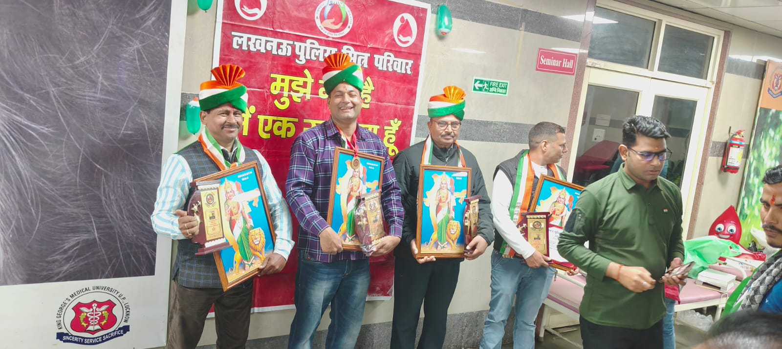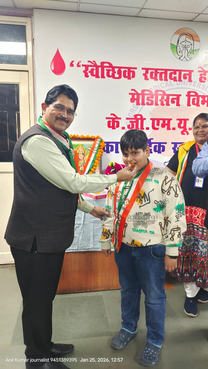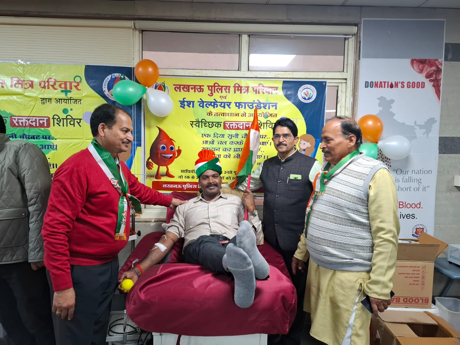 लखनऊ । गणतंत्र दिवस की पूर्व संध्या पर किंग जॉर्ज मेडिकल कॉलेज में लखनऊ पुलिस मित्र परिवार एवं ईश वेलफेयर फाउंडेशन के द्वारा स्वैच्छिक रक्तदान सिविर का आयोजन किया गया। शिविर मे 130 से अधिक समाज सेवियों एवं युवाओं ने सहभागिता की, जिसमें 70रक्तदाताओं व रक्त वीरांगनाओं ने "एक हाथ तिरंगा एक हाथ रक्तदान" का संकल्प लेते हुए मानवता एवं राष्ट्रहित में बढ़ चढ़कर रक्तदान किया! 27 रक्तदाता स्वास्थ्य कारणों से रक्तदान करने मे बिफल रहे।