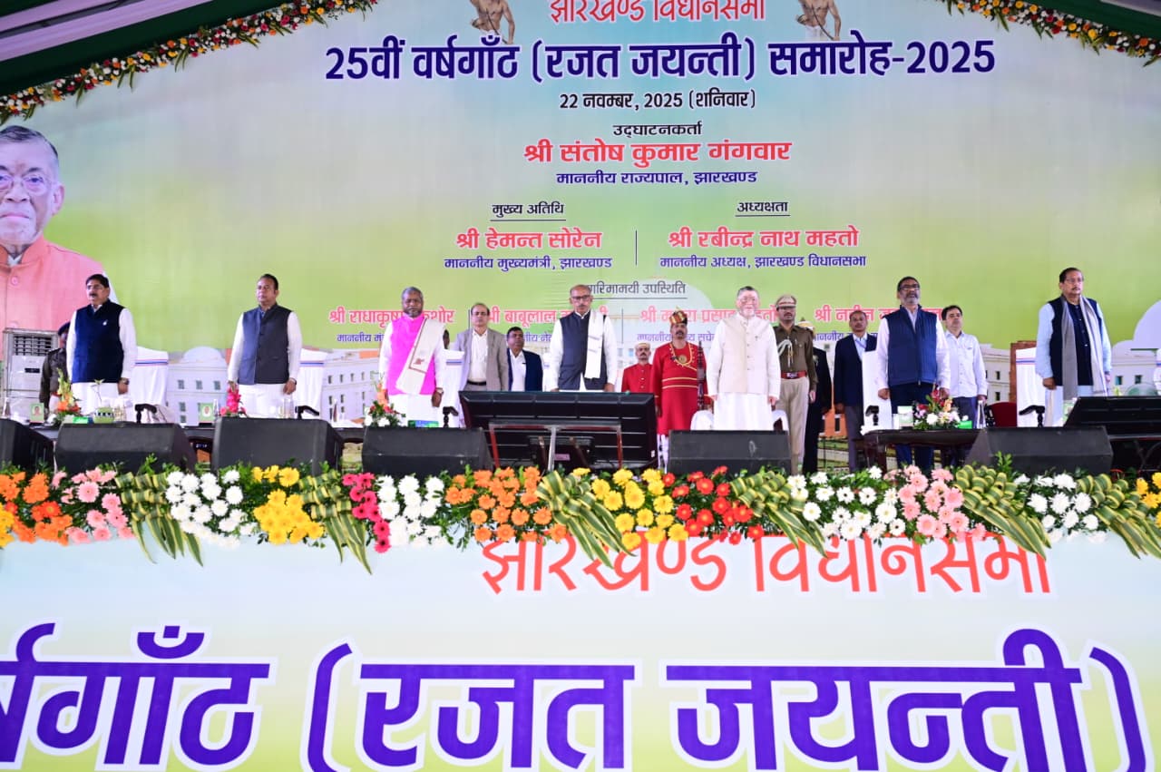 रांची : झारखंड विधानसभा परिसर में आज (22 नवंबर 2025) झारखंड विधानसभा की 25वीं वर्षगांठ (रजत जयंती) के अवसर पर एक भव्य एवं ऐतिहासिक समारोह का आयोजन किया गया। इस समारोह में माननीय राज्यपाल श्री संतोष कुमार गंगवार और माननीय मुख्यमंत्री श्री हेमन्त सोरेन मुख्य अतिथि के रूप में सम्मिलित हुए।