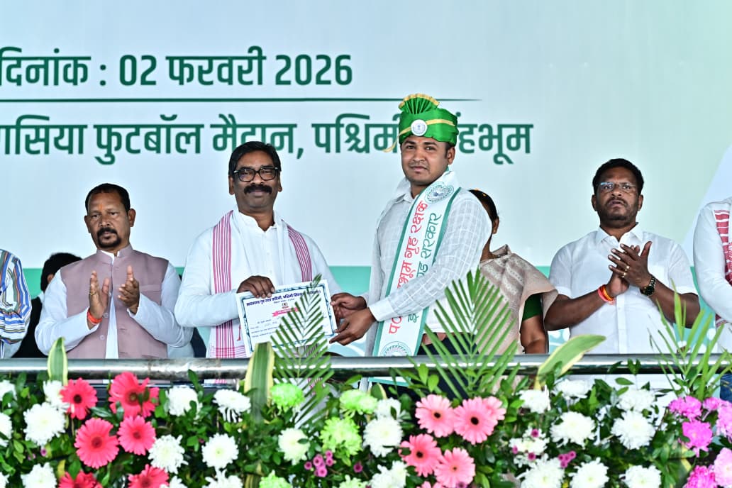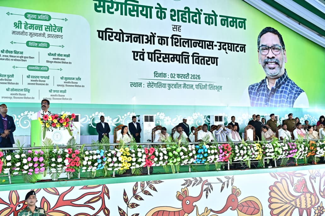 पश्चिमी सिंहभूम/टोटो, 02 फरवरी 2026: मुख्यमंत्री श्री हेमन्त सोरेन ने आज वीरों की भूमि सेरेंगसिया में अमर शहीद पोटो हो एवं अन्य वीर शहीदों को नमन किया। "सेरेंगसिया के शहीदों को नमन-सह-परियोजना शिलान्यास एवं परिसंपत्ति वितरण समारोह" को संबोधित करते हुए मुख्यमंत्री ने राज्य की जनता को 398 करोड़ से अधिक की विकास योजनाओं की सौगात दी और युवाओं को नियुक्ति पत्र सौंपे।
