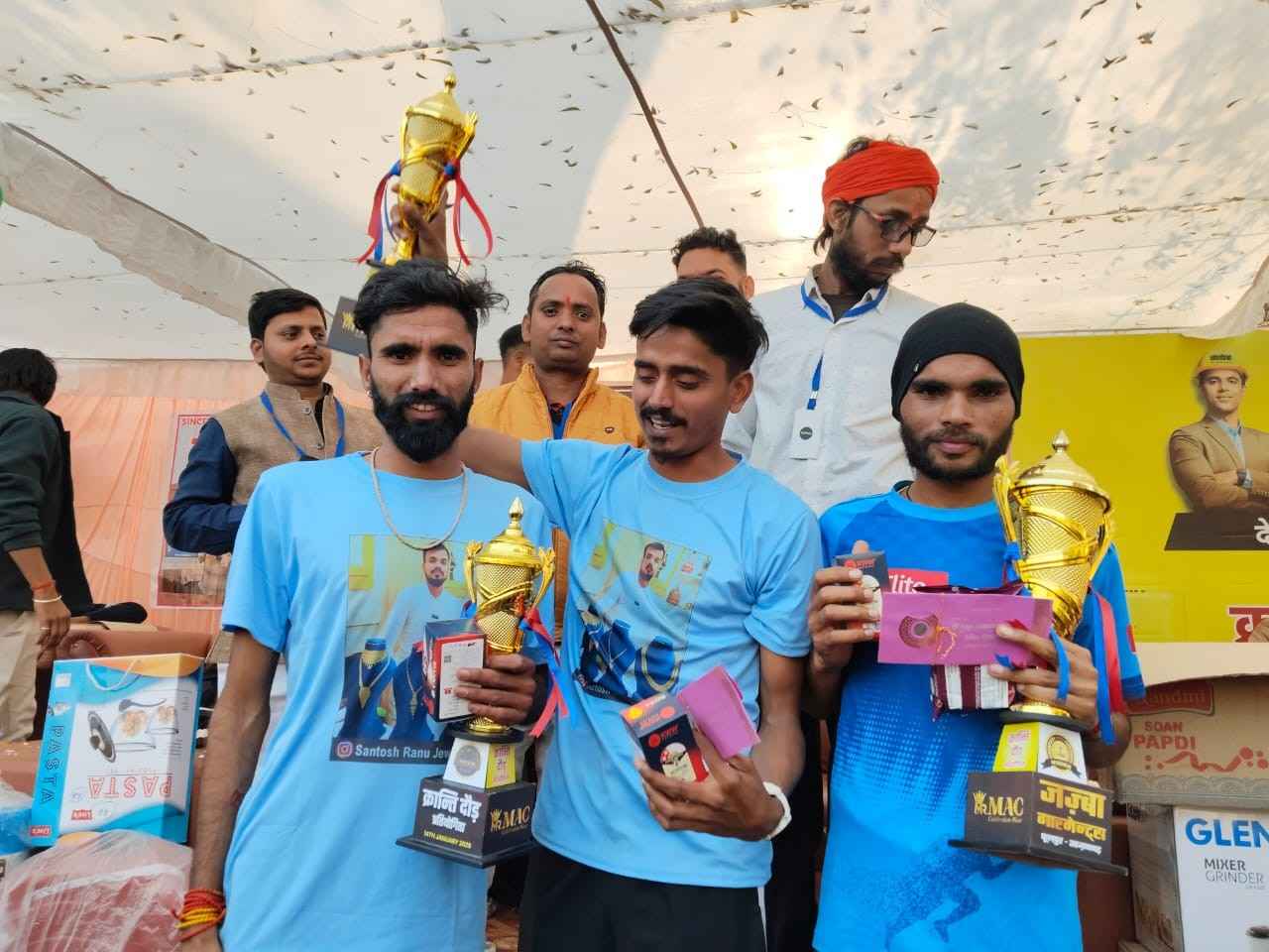 आजमगढ़। मकर संक्रांति के अवसर पर स्थानीय श्री शंकर जी तिराहा पर राष्ट्रीय स्तर पर क्रान्ति दौड़ पहुंचाने हेतु अग्रसर नव युवक क्रांति दल के नेतृत्व में लगातार 30 वे वर्ष भी अंतरराज्यीय व अंतर्जनपदीय क्रांति दौड़ का आयोजन किया गया। जिसमें 6 प्रान्तों के साथ विभिन्न जिलों के प्रतियोगी धावको ने भाग लिया। कार्यक्रम का शुभारंभ फूलपुर कोतवाली प्रभारी निरीक्षक सच्चिदानंद यादव,राम अशीष, राजेश मोदनवाल, भानु प्रताप चौहान ने फीता काट कर संयुक्त रूप से किया। कुल 510, प्रतियोगी धावकों ने भाग लिया। सभी धावकों को तीन ग्रुप में बांटा गया। लगभग 3 किमी शंकर जी तिराहा से, मेन रोड बाबा परमहंस जी मार्ग, रामलीला मैदान, पशु अस्पताल तिराहा से कालेज रोड , मा भवानी तिराहा, पुरानी सब्जी मंडी, चूना चौक, शनिचर बाजार होते हुए पुनः शंकर जी तिराहा तक दौड़ लगाए। तीनों ग्रुपों से 30,30 ,30 प्रतिभागी छांटें गए। सभी 90 प्रतिभागियो को फाइनल राउंड में दौड़ लगाई। जिसमें प्रथम पुरस्कार, मुजफ्फरनगर के अक्षय कुमार ने प्रथम पुरस्कार बाइक पर कब्जा जमाया।द्वितीय पुरस्कार, प्रिन्स राज रोहतास हरियाणा,तृतीय पुरस्कार, हेमराज राजस्थान, ने प्राप्त किया।सभी 90 प्रतिभागियो को फ्रीज, वॉशिंग मशीन, कूलर, साइकिल, सिलाई मशीन, आदि सहित 90 फाइनल सभी प्रतिभागियों को पुरस्कृत किया गया। 6 प्रान्त उत्तर प्रदेश, मध्यप्रदेश, पंजाब, हरियाणा, मध्य प्रदेश, बिहार के प्रतिभागियों ने 37 जिलों के प्रतिभागी अपनी जोर लगाई। वाराणसी 22, प्रतापगढ़ 10, फिरोजाबाद 5, अयोध्या 5 लखनऊ 5, कौशाम्बी 4, बलिया 3, सहित बाकी जिलों के 1,,2 ने फाइनल में अपनी पकड़ बनाए रखी, सभी 90 फाइनल प्रतिभागियों को नीले रंग का टी शर्ट पहनाकर भारत माता की जय के साथ नगर भ्रमण कराया गया। फाइनल राउंड से पूर्व राष्ट्रगान के बाद गुब्बारा उड़ाकर 1,2,3, गिनती से शुरू किया गया। कार्यक्रम का संचालन अनिल प्रजापति , शैलेन्द्र प्रजापति ने किया। इस अवसर पर श्यामबहादुर सिंह यादव, अज़ीम,सुरेश मौर्य, राजू प्रजापति,अखिलेश,रितेश,बृजेश, राजेश्वर बाबा, सुनील,, संतोष पुजारी आदि शामिल रहे। प्रशासनिक व्यवस्था स्वयं प्रभारी सच्चिदानंद के निगरानी में दुरुस्त रही,तो एम्बुलेंस भी धावकों के पीछे दौड़ लगाती रही।![]()