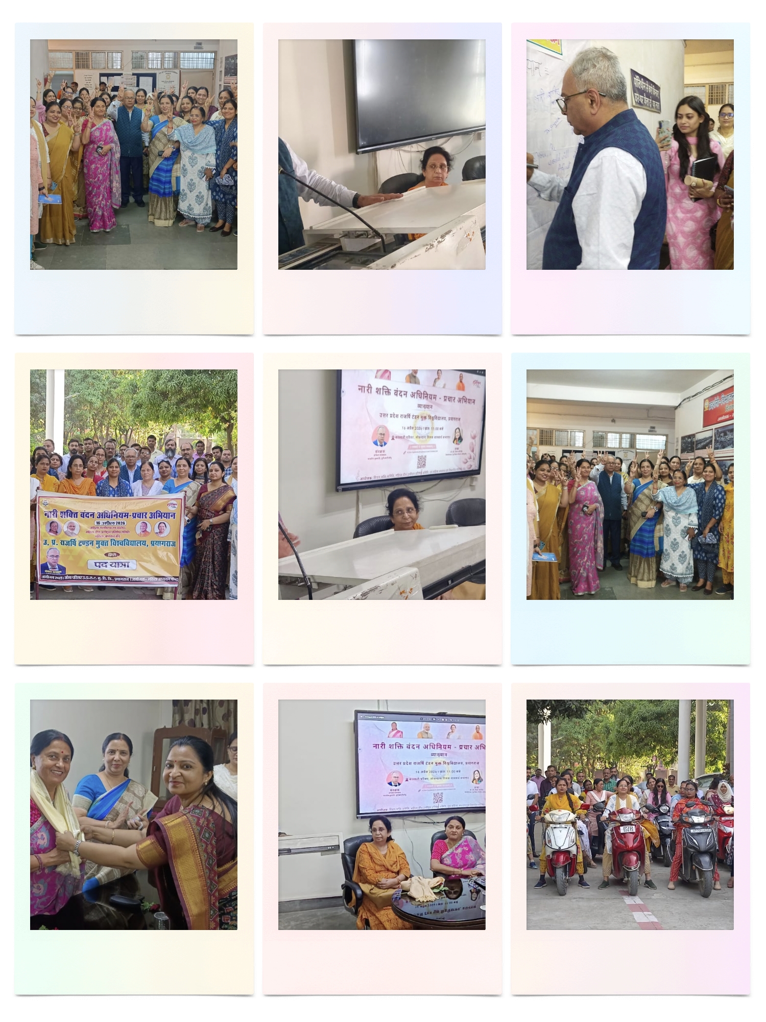 आयोजन के सूत्रधार कुलपति प्रोफेसर सत्यकाम ने कहा कि हम एक नए युग की तरफ बढ़ रहे हैं। हर एक समाज की अपनी अपनी संरचना होती है। उस संरचना का प्रभाव हर एक विकासशील पथ पर पड़ता है। प्रोफेसर सत्यकाम ने कहा कि प्रधानमंत्री के इस कदम का स्वागत किया जाना चाहिए। उन्होंने महिला शिक्षा को बढ़ावा देने के लिए लोगों को प्रेरित किया। उन्होंने कहा कि शिक्षा से ही बदलाव आएगा। कुलपति प्रोफेसर सत्यकाम ने मिस्ड कॉल अभियान एवं दीवार पर हस्ताक्षर कार्यक्रम को सफल बनाने के लिए महिलाओं के प्रति आभार व्यक्त किया। इस अवसर पर उन्होंने हरी झंडी दिखाकर स्कूटी रैली तथा पदयात्रा का शुभारंभ किया। शिक्षिकाओं, शोध छात्राओं तथा महिला कर्मचारियों ने विश्वविद्यालय में मानव श्रृंखला बनाकर नारी शक्ति वंदन अधिनियम जागरूकता प्रचार-प्रसार अभियान में सक्रिय सहभागिता की।