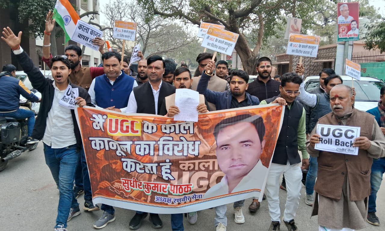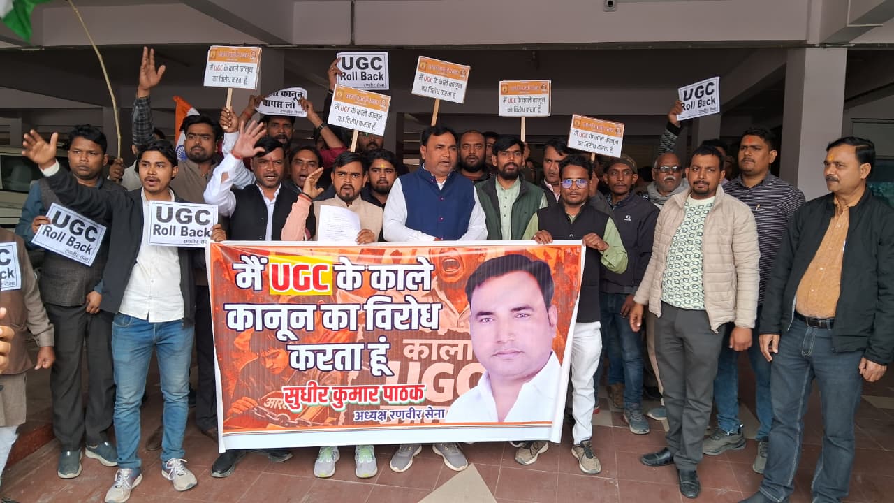 इसलिए यह कानून सिर्फ SC, ST, OBC के लिए ही न बनकर भारत के प्रत्येक नागरिक के लिए समान हो। यदि किसी के द्वारा की गई शिकायत झूठी पाई जाती है, तो ऐसे मामलों में झूठी शिकायत करने वाले के विरुद्ध जुर्माना लगाया जाए, ताकि कानून का दुरुपयोग रोका जा सके। भविष्य में किसी भी प्रकार के कानून का निर्माण जाति के आधार पर न किया जाए, बल्कि सभी नागरिकों के लिए समान और न्यायसंगत व्यवस्था सुनिश्चित की जाए। चेतावनी देते हुए कहा कि यदि 15 दिनों में यूजीसी कानून वापस नहीं लिया गया तो हम सभी स्वर्ण भाजपाइयों को चूड़ी बांटेंगे और जिले से लेकर प्रदेश स्तर तक धरना तेज करेंगे। इस दौरान दुर्गा चौबे, राहुल सिंह, आलोक सिंह, डीएन सिंह, गुलाब सिंह, संजय सिंह, ऋषभ पाण्डेय, नीतीश पाण्डेय, विशाल चौबे, अभिषेक तिवारी सहित बड़ी संख्या में स्वर्ण उपस्थित रहे।