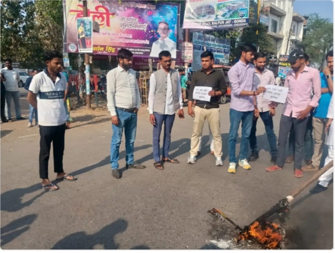 गोंडा।उत्तर प्रदेश पुलिस उपनिरीक्षक भर्ती परीक्षा में पूछे गए एक विवादित प्रश्न को लेकर पूरे प्रदेश में विरोध प्रदर्शन जारी है।इसी क्रम में जिले में राष्ट्रीय छात्र पंचायत के पदाधिकारियों और कार्यकर्ताओं ने उत्तर प्रदेश पुलिस भर्ती आयोग के अध्यक्ष आईपीएस एस बी शिरोडकर का पुतला फूंका।यह प्रदर्शन जिला मुख्यालय स्थित लाल बहादुर शास्त्री चौराहे पर किया गया।