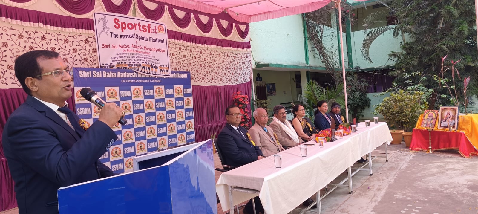 अम्बिकापुर- प्ले हार्ड-पार्टी हार्ड... ये पंक्तियां श्री साई बाबा आदर्श स्नातकोत्तर महाविद्यालय में आयोजित तीन दिवसीय स्पोर्ट्स फेस्ट-2026 के उद्घाटन अवसर पर अम्बिकापुर सैनिक कल्याण बोर्ड के अध्यक्ष उम्मेद सिंह चरन ने कही। उन्होंने कहा कि खेल जीवन के प्रत्येक पायदान पर है। खेलों से प्रतिस्पर्धा, मनोरंजन के साथ शरीर को शक्ति मिलती है, जो हमें ऊर्जावान बनाती है। उन्होंने सभी खिलाड़ियों को शुभकामना देते श्रेष्ठ प्रदर्शन का आह्वान किया।