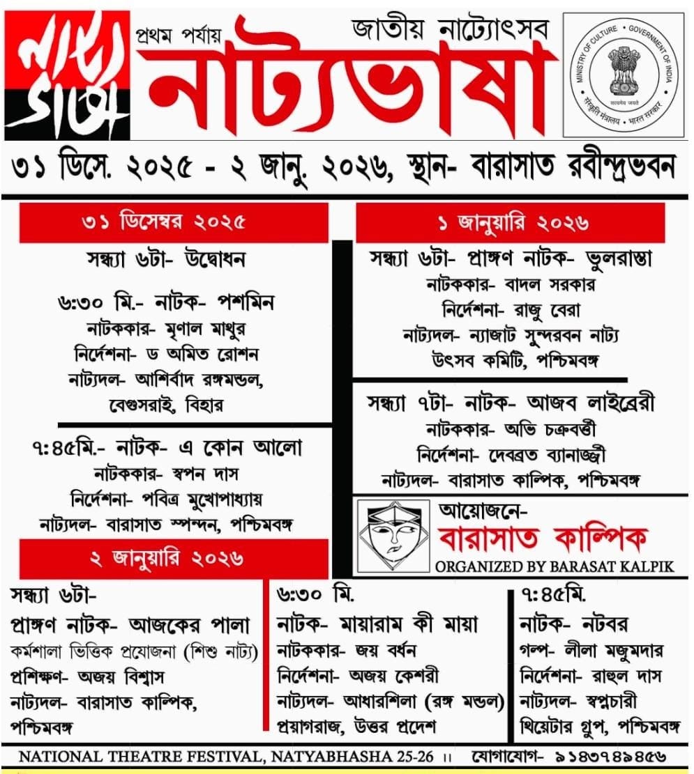 নিজস্ব সংবাদদাতা: বারাসাত কাল্পিকের উদ্যোগে আগামী ৩১ শে ডিসেম্বর' ২০২৫ থেকে ২ রা জানুয়ারি' ২০২৬ পর্যন্ত বারাসাত রবীন্দ্রভবন প্রেক্ষাগৃহে অনুষ্ঠিত হতে চলেছে নাট্যোৎসব 'নাট্যভাষা' ২০২৫-২৬। রাজ্যের সব জেলা থেকে নাট্যদল এই নাট্য উৎসবে তাদের নাটক পরিবেশন করবে।