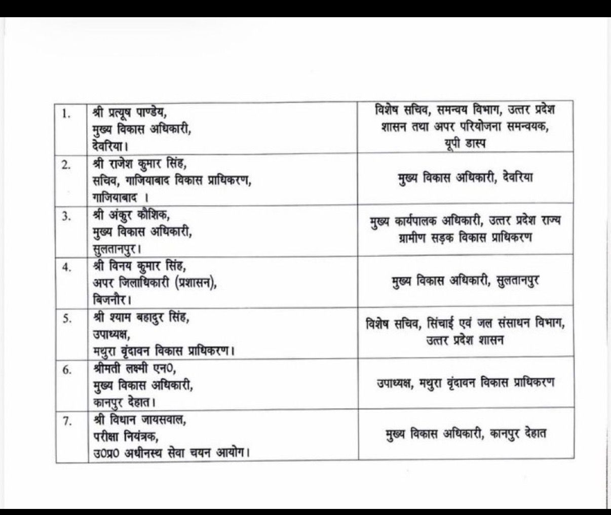 यूपी में 7 आईएएस अधिकारियों का हुआ तबादला। सुल्तानपुर के मुख्य विकास अधिकारी आईएएस अंकुर कौशिक का हुआ ट्रासंफर। राज्य ग्रामीण सड़क विकास प्राधिकरण यूपी के मुख्य कार्यपालक अधिकारी बनाये गए।