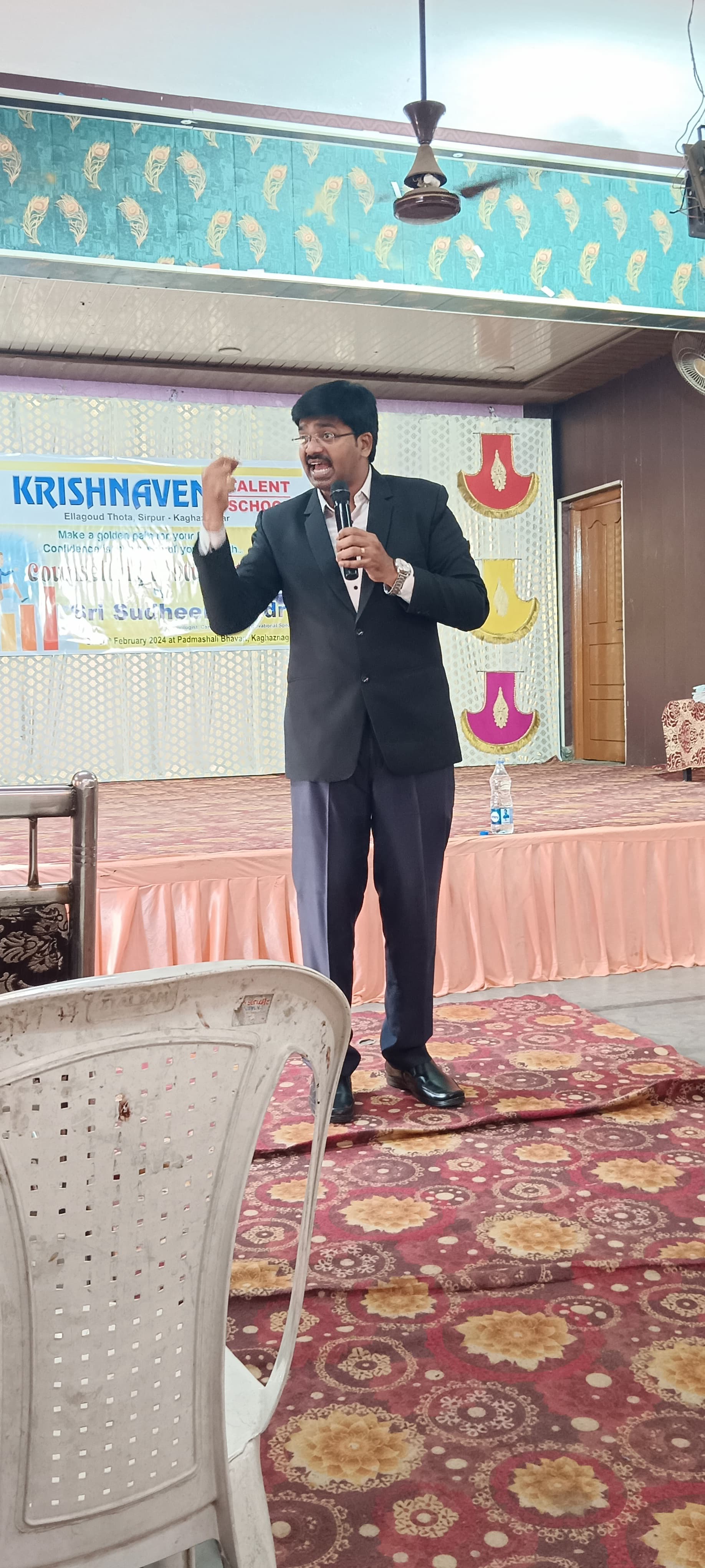 కుమ్రంభీంఆసిఫాబాద్ :సమయపాలన,క్రమశిక్షణ,నిరంతర సాధనతో విద్యార్థుల భవిష్యత్ పురోగమించవచ్చునని సైకాలజిస్ట్ సండ్ర సుధీర్ అన్నారు. ఆదివారం రోజున కొమురం భీం ఆసిఫాబాద్ జిల్లా కాగజ్ నగర్ కృష్ణవేణి పాఠశాల ఆధ్వర్యంలో పద్మశాలి భవనంలో నిర్వహించిన కార్యక్రమంలో ఆయన ముఖ్య అతిధిగా హాజరై విద్యార్థులు దిశ నిర్ధేశం చేశారు.ఈ సందర్భంగా పరీక్షల సమయం ఎలా సద్వినియోగం చేసుకోవాలి,ఎలాంటి కార్యాచరణ ప్రణాళిక ద్వారా వారు చదువులోనే కాదు జీవితంలో కూడా ముందుకు వెళతారు అని విద్యార్థుల భవిష్యత్తు ప్రణాళికను ఎంతో అద్భుతమైన రీతిలో సైకాలజిస్ట్ సండ్ర సుధీర్ తెలియచేశారు. విద్యార్థులకి ఎంతగానో ఉపయోగపడేలా ఇంత మంచి కార్యక్రమం నిర్వహించాలి అని ఆలోచన చేసిన కృష్ణవేణీ యాజమాన్యాన్ని వారు కొనియాడారు.సమయపాలన, క్రమ శిక్షణ, నిరంతర సాధన ద్వారా విద్యార్థులు పురోగమించవచ్చని తెలిపారు.ప్రొడక్టివ్, సూపర్ ప్రొడక్టివ్ వైపు మన గమనం ఉండాలని, తప్పుడు మనుషులతో స్నేహం, తప్పుడు పనులు చేయరాదని చెప్పారు. మీ పేరు ముందున్న ఇంటి పేరుతో కాకుండా మీ పేరు తరువాత మీ ఘనత పెట్టుకునే వైపు పయనించాలని సూచించారు. దీక్షతో ప్రయత్నిస్తే ఫలితాలు (focus-effort-result) వస్తాయని, తాత్కాలిక ఆనందం కోసం కాకుండా మంచి భవిష్యత్ కోసం కష్టపడాలని విద్యార్థులను కోరారు. ఈ నేపథ్యంలో గురువులను గౌరవించాలని, వారు చెప్పిన దారిలో పయనించాలని చెప్పారు. మన జీవితం లో అమ్మ, నాన్న, గురువు, సైనికులు, మనకు అన్నం పెట్టే రైతులే నిజమైన కథానాయకులని, వారిని గౌరవించడం మన బాధ్యత అని అన్నారు. సమయానికి విలువ ఇవ్వాలని, లేనిచో గెలుపు పరుగులో ఓడిపోవడం తద్యమని హెచ్చరించారు.ఈ కార్యక్రమంలో కరస్పాండెంట్ దోమల సురవర్థన్, జియా - ఉల్ - హక్ ,దోమల వేద ప్రవీణ్, ప్రిన్సిపాల్ శ్రీనివాస్ పాఠశాల ఉపాధ్యాయులు, విద్యార్థులు మరియు విద్యార్థుల తల్లి తండ్రులు ఇందులో పాల్గొన్నారు.