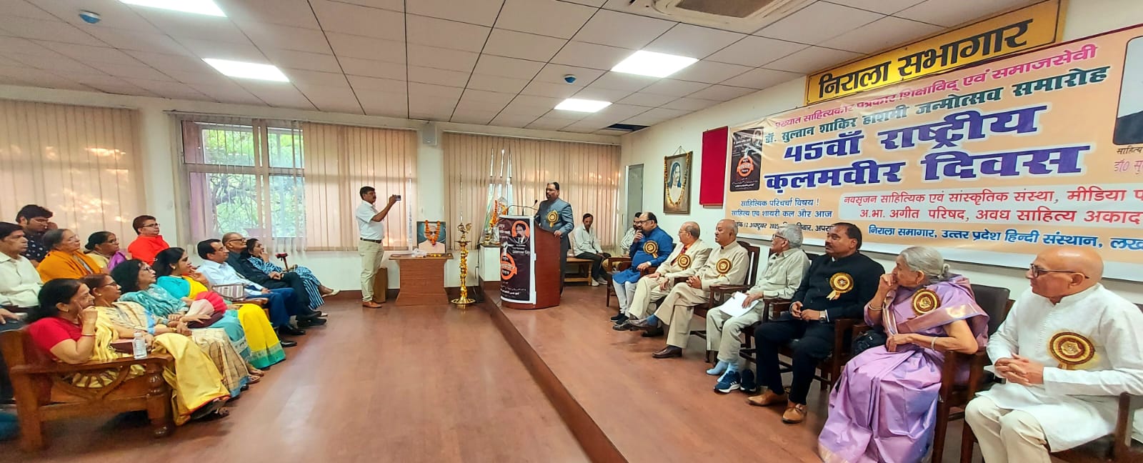 लखनऊ। 45वें राष्ट्रीय कलमवीर दिवस समारोह का आयोजन आज सम्पन्न हुआ।नवसृजन साहित्यिक एवं सास्कृतिक संस्था, अखिल भारतीय अगीत परिषद, अवध साहित्य अकादमी एवं मीडिया फाउण्डेशन के संयुक्त तत्वावधान में विभिन्न भाषाओं में 60 से अधिक महत्वपूर्ण पुस्तकों के लेखक, वरिष्ठ साहित्यकार, पत्रकार एवं शिक्षाविद डॉ. सुल्तान शाकिर हाशमी के जन्मोत्सव के अवसर पर 'राष्ट्रीय कलमवीर दिवस का आयोजन।आज, निराला सभागार,उत्तर प्रदेश हिन्दी संस्थान में प्रोफेसर डॉ. वी जी गोस्वामी (पूर्व अधिष्ठाता विधि संकाय लखनऊ विश्वविद्यालय) की अध्यक्षता में सम्पन्न हुआ।