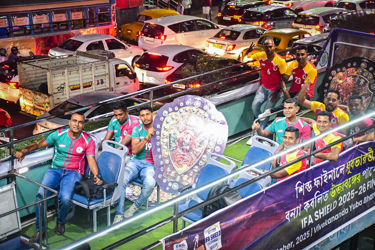 Khabar kolkata sports Desk: ১২৫ তম আইএফএ শিল্ডের ফাইনালে ডার্বি ম্যাচের আগে বৃহস্পতিবার আইএফএর উদ্যোগে আইএফএ শিল্ড কার্নিভাল অনুষ্ঠিত হল কলকাতায়। একটি বাস ঐতিহ্যমন্ডিত আইএফএ শিল্ড পরিক্রমা করল মহানগরীর রাজপথে। সুসজ্জিত বাসে শিল্ডের সঙ্গে ছিলেন মোহনবাগান ও ইস্টবেঙ্গলের দলের প্রাক্তন ফুটবলাররা। বাসটি ধর্মতলা থেকে ছেড়ে দক্ষিণ কলকাতা বিভিন্ন পথ পরিক্রমা করে ইস্টার্ন মেট্রোপলিটন বাইপাসের পাটুলি ফুড পার্কে যাত্রা শেষ করে। এই ফুড পার্কে ফুটবলারদের নিয়ে টক শো অনুষ্ঠিত হয়। আলভিটো ডি কুনহা, মেহতাব হোসেন, রহিম নবি, ডেনসন দেবদাস, দীপক মন্ডল, অসীম বিশ্বাস, সুভাষ চক্রবর্তী, দীপঙ্কর রায় ,অর্ণব মন্ডল, সৌমিক দে অংশ নেন। উপস্থিত ছিলেন আইএফএ এর সভাপতি দিলীপ নারায়ন সাহা।শিল্ড নিয়ে টক শোর পাশাপাশি কুইজ অনুষ্ঠিত হয়। সফল উত্তরদাতাদের ফাইনাল ম্যাচের টিকিট পুরস্কার হিসেবে দেওয়া হয়।আজ শুক্রবার আইএফএ শিল্ড একই ভাবে উত্তর কলকাতার বিভিন্ন পথ পরিক্রমা করবে।