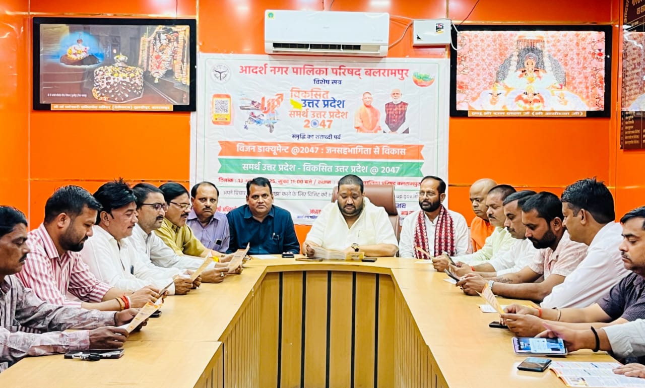 बलरामपुर।आदर्श नगरपालिका परिषद,बलरामपुर में "विकसित भारत - विकसित उत्तर प्रदेश" एवं "आत्मनिर्भर भारत - आत्मनिर्भर उत्तर प्रदेश" के विजन 2047 को ध्यान में रखते हुए एक विशेष सत्र का आयोजन किया गया। यह सत्र अध्यक्ष डॉ.धीरेन्द्र प्रताप सिंह 'धीरू' की अध्यक्षता में संपन्न हुआ,जिसमें 2047 तक समर्थ और समृद्ध उत्तर प्रदेश के निर्माण हेतु जनसहभागिता के माध्यम से विकास के संकल्प को दोहराया गया।