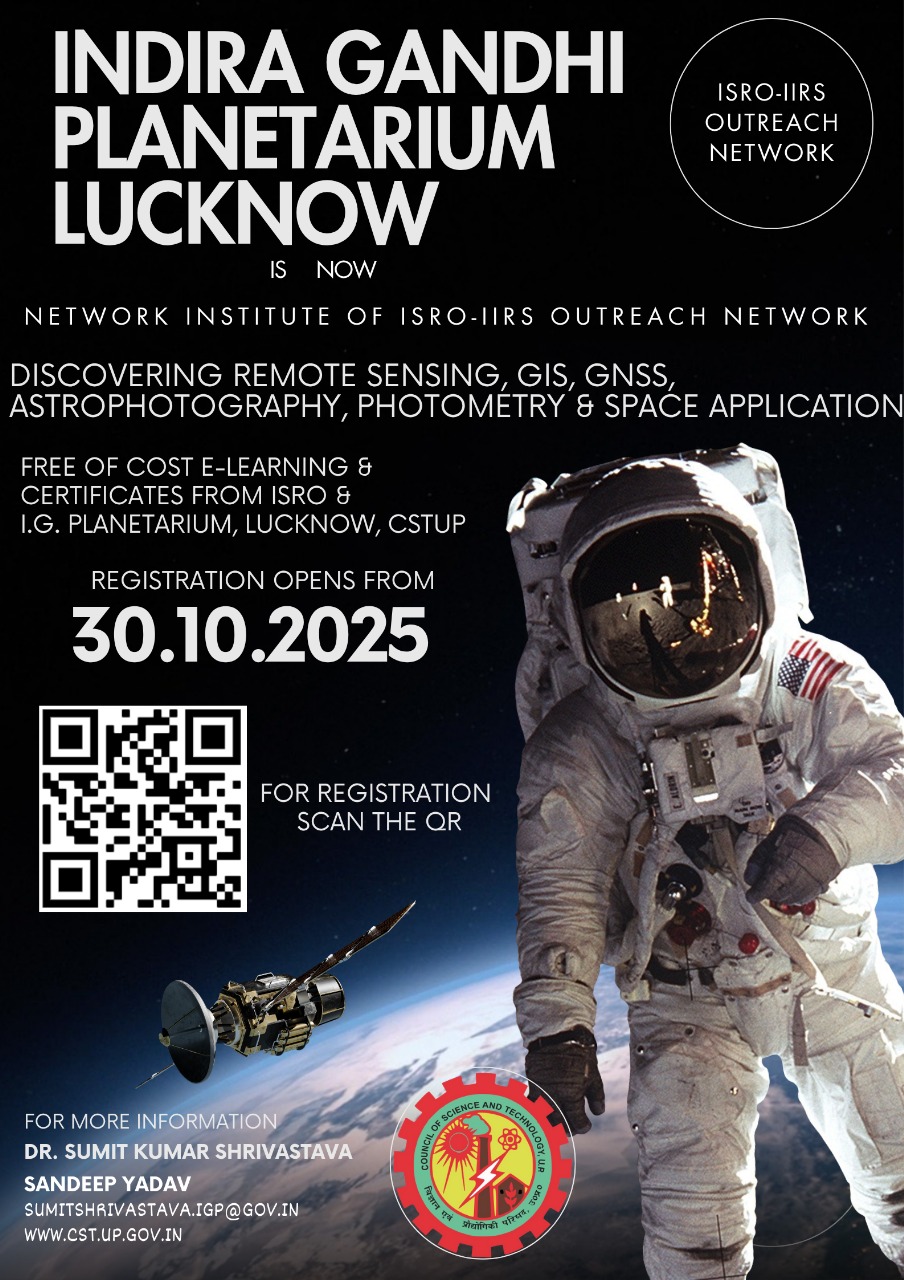 इंदिरा गांधी नक्षत्रशाला ने IIRS–ISRO  के ऑनलाइन प्रशिक्षण कार्यक्रमों हेतु पंजीकरण प्रारंभ कर दिया है, जिसके सफल समापन पर प्रतिभागियों को IIRS–ISRO  द्वारा प्रमाणपत्र (E-Certificate) प्रदान किया जाएगा। यह सहयोग उत्तर प्रदेश में अंतरिक्ष आधारित शिक्षा, रिमोट सेंसिंग और जीआईएस अनुप्रयोगों को सशक्त बनाने की दिशा में एक महत्वपूर्ण कदम है।