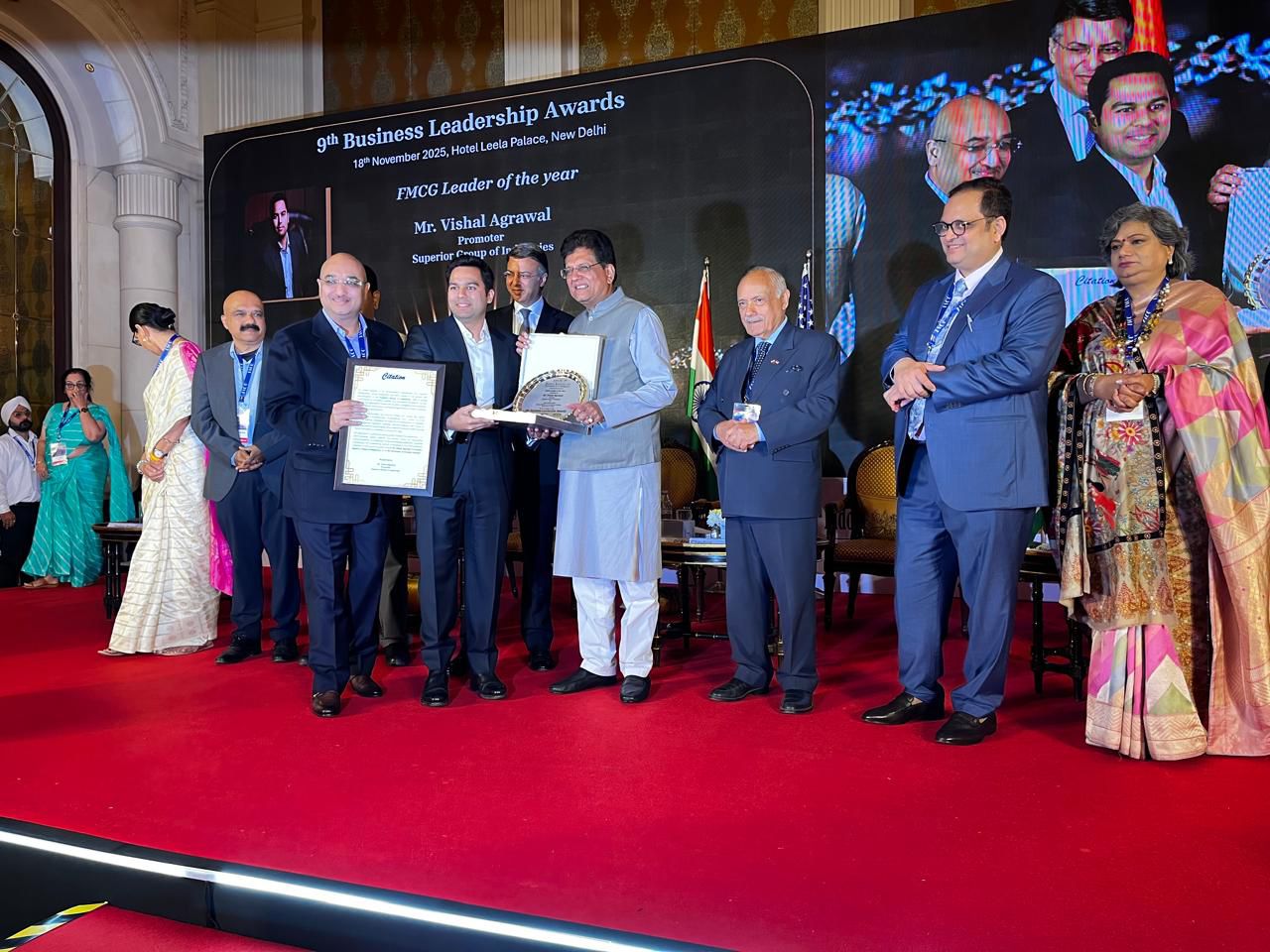 आज इंडो-अमेरिकन चैंबर ऑफ कॉमर्स द्वारा आयोजित प्रतिष्ठित समारोह में सुपीरियर ग्रुप ऑफ इंडस्ट्रीज के चेयरमैन श्री प्रदीप अग्रवाल एवं वाइस चेयरमैन श्री विशाल अग्रवाल को एफएमसीजी सेक्टर में किए गए अभूतपूर्व नवाचारों और महत्वपूर्ण योगदानों के लिए “लीडर ऑफ द ईयर 2025” अवॉर्ड से सम्मानित किया गया। यह सम्मान भारत सरकार के केंद्रीय वाणिज्य एवं उद्योग तथा रेल मंत्री श्री पीयूष गोयल द्वारा प्रदान किया गया।