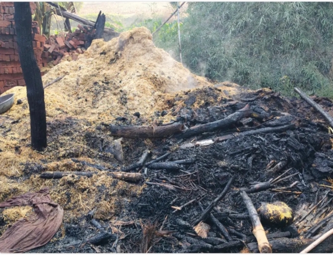 घर में लगी आग से भैंस जलकर मरी,लाखों का सामान जलकर राख, परिवार बेघर