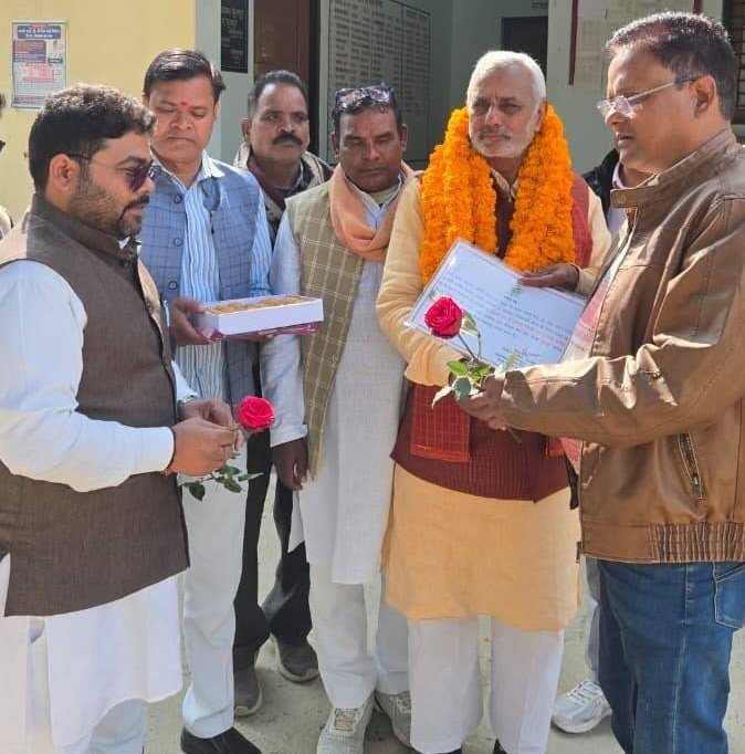आजमगढ़। फूलपुर ब्लॉक में भूमि विकास बैंक के अध्यक्ष पद के लिए हनुमन्त सिंह निर्विरोध निर्वाचित हुए हैं। नामित चुनाव अधिकारी और फूलपुर तहसीलदार राजू कुमार ने उन्हें अध्यक्ष पद का प्रमाण पत्र सौंपा और बधाई दी। इस अवसर पर भाजपा कार्यकर्ताओं ने नवनिर्वाचित अध्यक्ष हनुमन्त सिंह का फूल मालाओं से स्वागत किया। इस दौरान भाजपा के कई पदाधिकारी और कार्यकर्ता मौजूद रहे। उपस्थित गणमान्य लोगों में दिलीप सिंह बघेल, दुर्गेश अग्रहरि, नागेंद्र यादव, अमित सिंह, विमलेश पाण्डेय, रत्नेश बिंद, घनश्याम गिरी और हरिशंकर सोनी शामिल थे। सभी ने नवनिर्वाचित अध्यक्ष हनुमंत सिंह का फूल मालाओं से स्वागत किया। नवनिर्वाचित अध्यक्ष हनुमंत सिंह ने कहा कि वे सरकार की मंशा के अनुसार काम करेंगे। उन्होंने भूमि विकास बैंक को आगे बढ़ाने और किसानों के हित को ध्यान में रखते हुए अधिक से अधिक किसानों को लाभ पहुंचाने का संकल्प लिया। तहसीलदार राजू कुमार ने हुनमन्त सिंह के निर्विरोध निर्वाचन को लोकतांत्रिक प्रक्रिया की सफलता बताया। उन्होंने नवनिर्वाचित अध्यक्ष को उनके उज्ज्वल कार्यकाल के लिए शुभकामनाएं दीं।