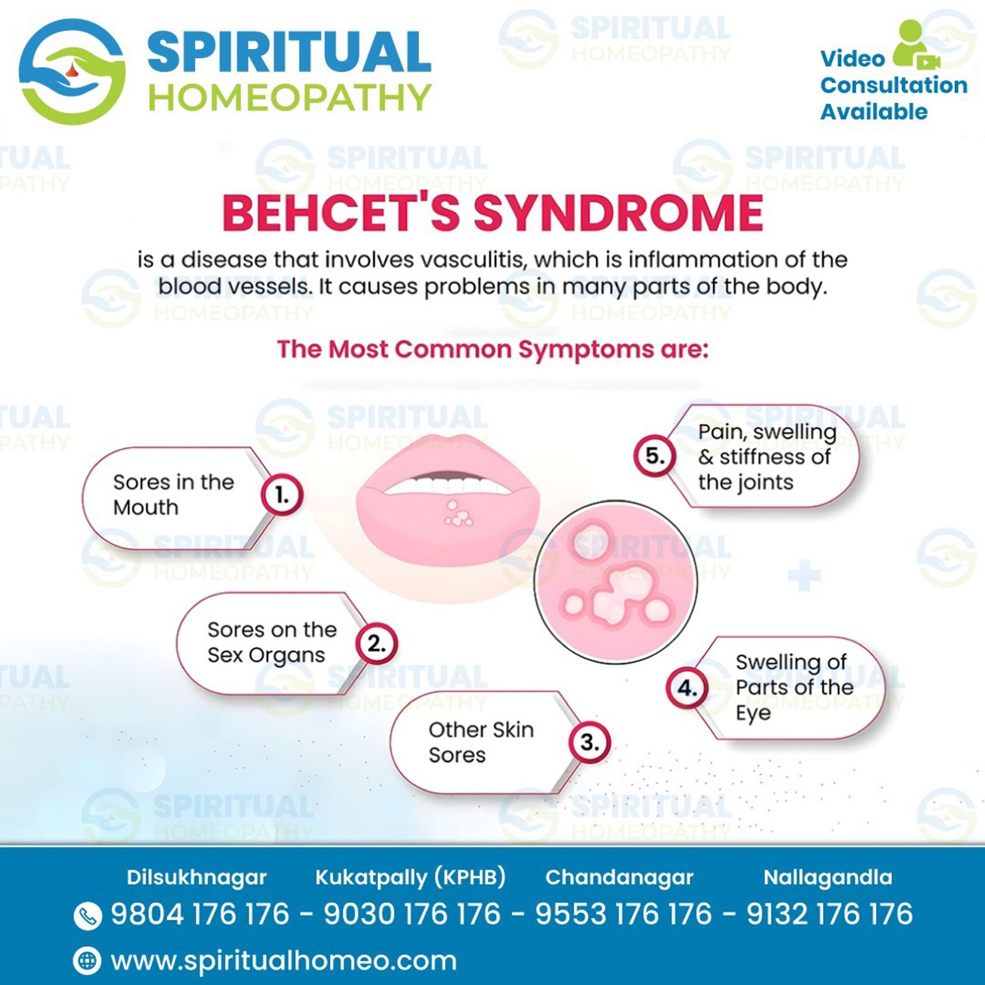 With branches in KPHB, Dilsukhnagar, Chandanagar, and Nallagandla, Spiritual Homeopathy makes professional homeopathy accessible across Hyderabad. Their approach focuses on natural healing, immunity strengthening, and improving quality of life, making it a preferred choice for managing Behcet’s Syndrome with homeopathy in Hyderabad.